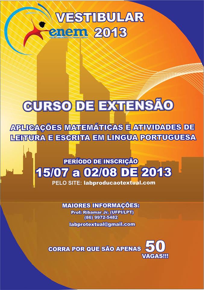 O Laboratório de Leitura e Produção Textual (LPT), em parceria com a Coordenação de Ensino Médio, está com inscrições abertas para o curso de extensão Aplicações Matemáticas e Atividades de Leitura e Escrita em Língua Portuguesa. O curso será realizado no período de 9 de setembro a 19 de outubro de 2013, às quintas ou sextas-feiras, das 19h às 21h, no Colégio Técnico de Floriano.