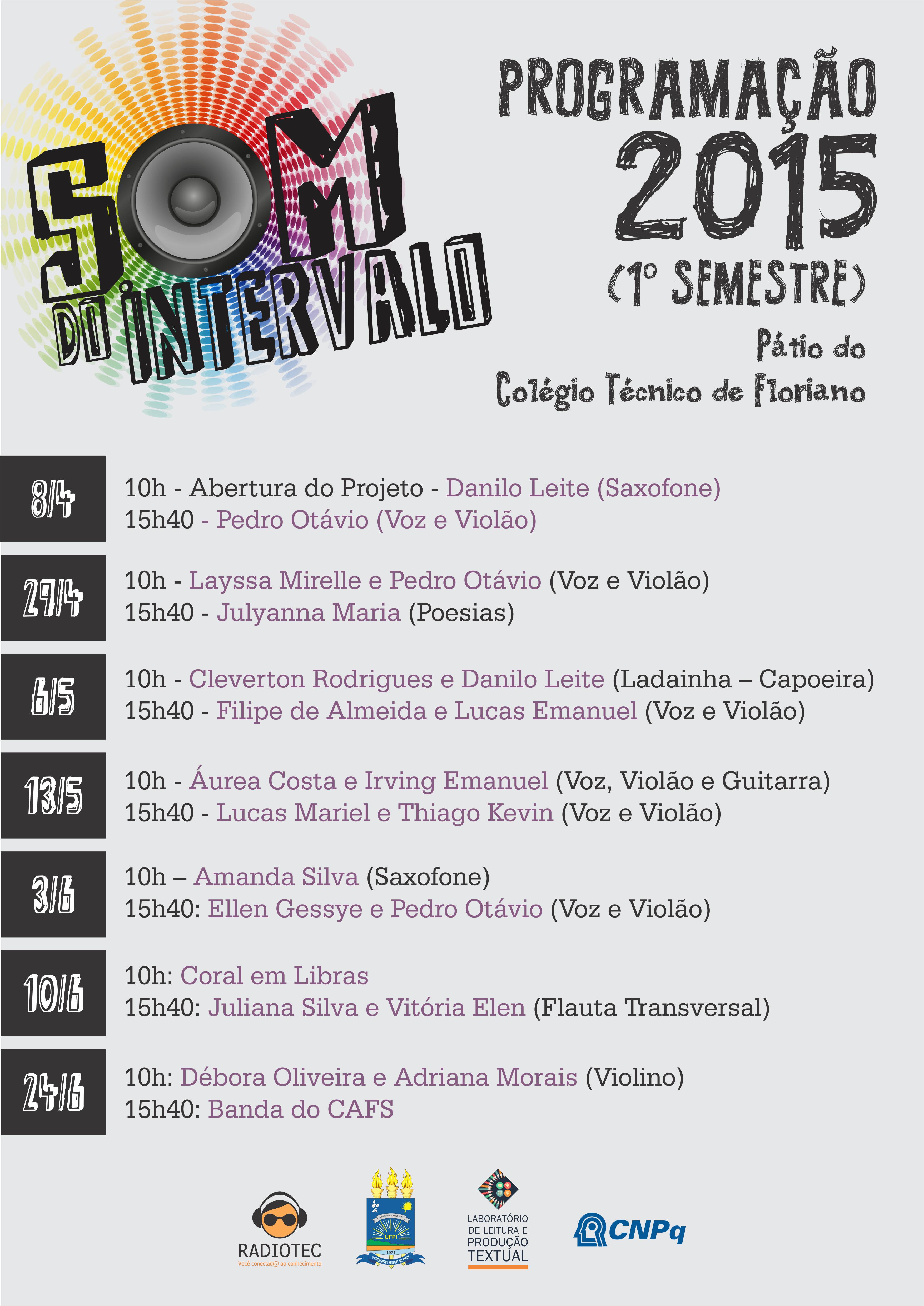 Iniciamos, em 2015, o projeto Som do Intervalo com a finalidade de proporcionar atividades artístico-culturais, bem como valorizar os jovens talentos do Colégio Técnico de Floriano. Confiram a programação das apresentações do 1º semestre.