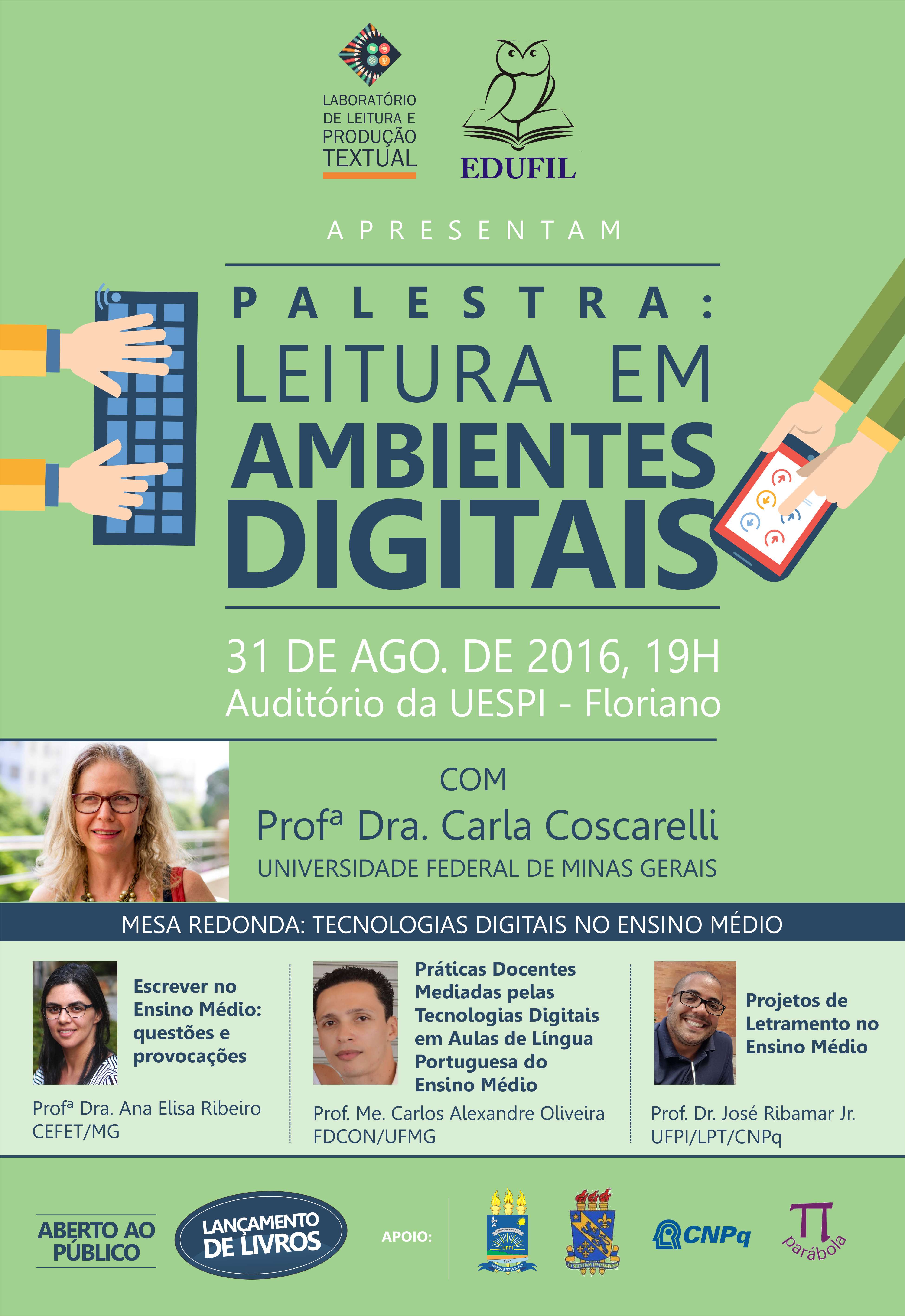 O Laboratório de Leitura e Produção Textual (CTF/UFPI/CNPq) e EDUFIL convidam para Palestra e Mesa-Redonda sobre Letramento Digital. A atividade conta com apoio do CNPq, da Parábola Editorial e da Universidade Estadual do Piauí (Campus Floriano). Inscrições no dia do evento. Certificação: 4h