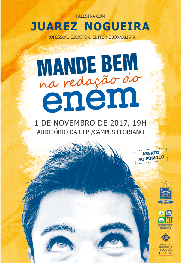 O Laboratório de Leitura e Produção Textual (LPT/CNPq), com apoio da Direção do Colégio Técnico de Floriano, realizará palestra sobre a Redação do Exame Nacional do Ensino Médio (ENEM 2017), no dia 1º de novembro de 2017, às 19h, no Auditório da Universidade Federal do Piauí, campus Floriano. O evento contará com a presença de Juarez Nogueira, professor e autor do livro “Mande bem na redação do Enem” (Editora Artigo A).