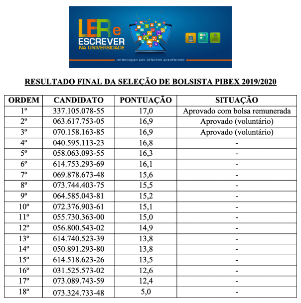 Resultado final da seleção de bolsista Pibex 2019/2020
