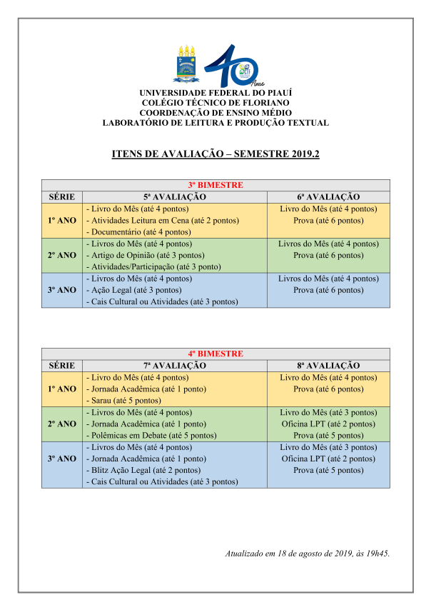 Divulgamos os itens a serem avaliados no período letivo 2019, na disciplina de Redação, com as turmas de 1º a 3º anos de Agropecuária e Informática: