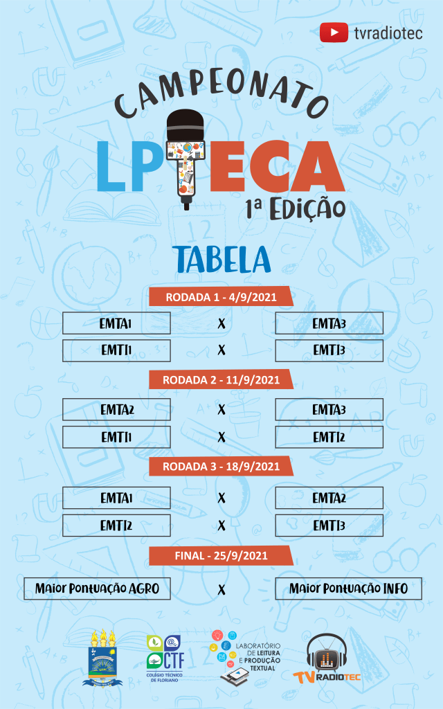 A TV Radiotec, canal do Laboratório de Leitura e Produção Textual (LPT/CNPq) do Colégio Técnico de Floriano (CTF/UFPI), realizará a 1ª edição do Campeonato LPTECA.