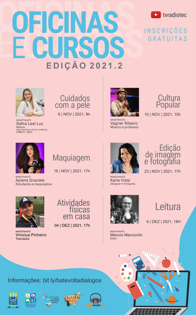 Estão abertas as inscrições gratuitas para a 1ª edição da ação Oficinas e Cursos do projeto de extensão Bate & Volta Diálogos do Laboratório de Leitura e Produção Textual (Colégio Técnico de Floriano/UFPI).