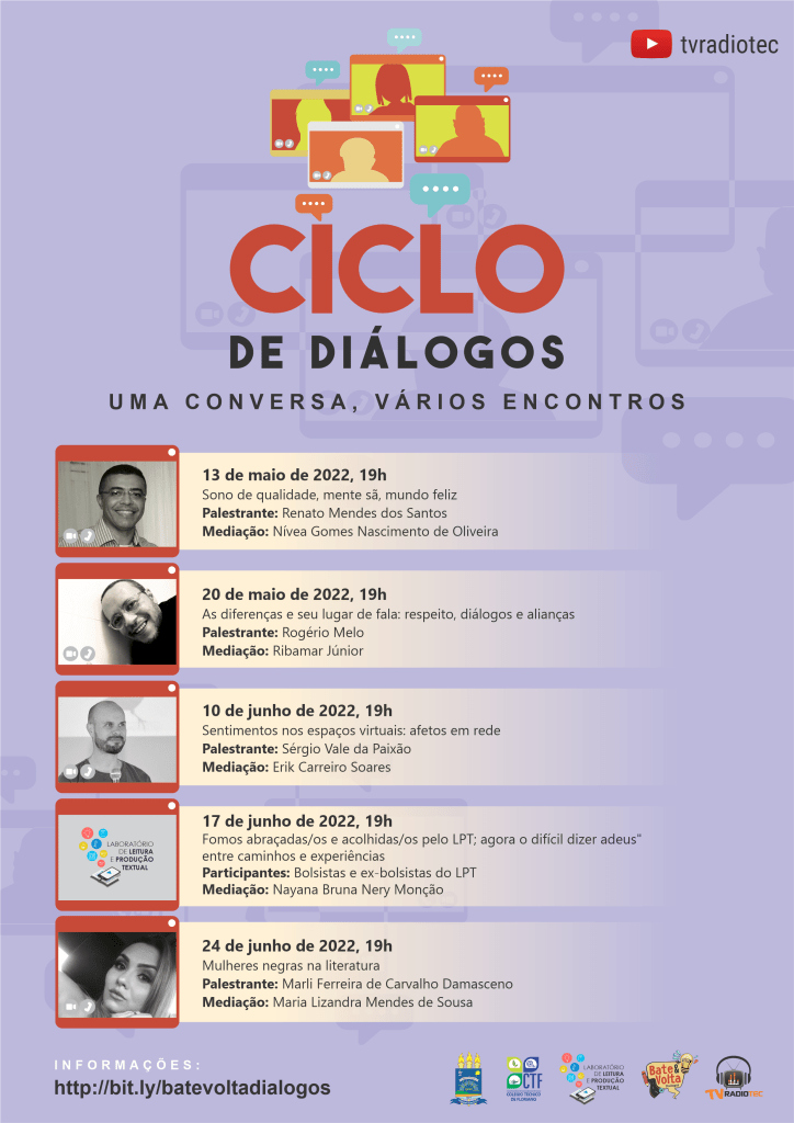 Estão abertas as inscrições gratuitas para a 4ª edição do Ciclo de Diálogos: uma conversa, vários encontros do projeto de extensão Bate & Volta Diálogos do Laboratório de Leitura e Produção Textual (LPT/CNPq) do Colégio Técnico de Floriano/UFPI). A atividade será realizada de forma on-line, no canal da TV Radiotec no YouTube.
