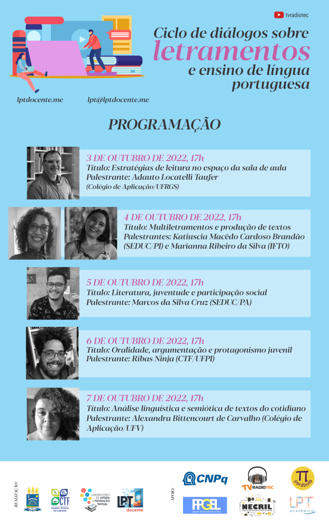 Estão abertas até 2 de outubro de 2022 as inscrições gratuitas para a primeira edição do Ciclo de Diálogos sobre Letramentos e Ensino de Língua Portuguesa, evento do projeto de pesquisa “Escola Virtual: Letramento digital para o ensino a distância e seu impacto na aprendizagem”, denominado LPT Docente, do Laboratório de Leitura e Produção Textual (LPT/CNPq) do Colégio Técnico de Floriano e coordenado pelo professor Ribamar Júnior.