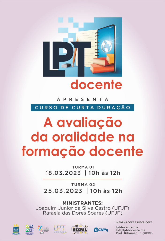 Estão abertas as inscrições gratuitas para o curso on-line de curta duração A avaliação da oralidade na formação docente promovido pelo projeto de extensão LPT Docente do Laboratório de Leitura e Produção Textual [LPT/CNPq] do Colégio Técnico de Floriano [UFPI], em parceria com Núcleo de Pesquisa em Estudos Críticos e Linguagem [NECriL]e a Pró-Reitoria de Extensão e Cultura (PREXC/UFPI).