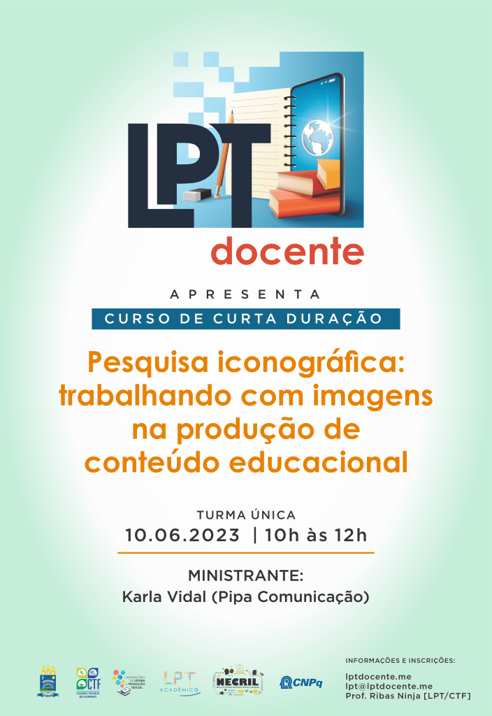 Estão abertas as inscrições gratuitas para o curso on-line de curta duração Pesquisa iconográfica: trabalhando imagens na produção de conteúdo educacional promovido pelo projeto de extensão LPT Docente do Laboratório de Leitura e Produção Textual [LPT/CNPq] do Colégio Técnico de Floriano [UFPI], em parceria com Núcleo de Pesquisa em Estudos Críticos e Linguagem [NECriL] e a Pró-Reitoria de Extensão e Cultura (PREXC/UFPI).