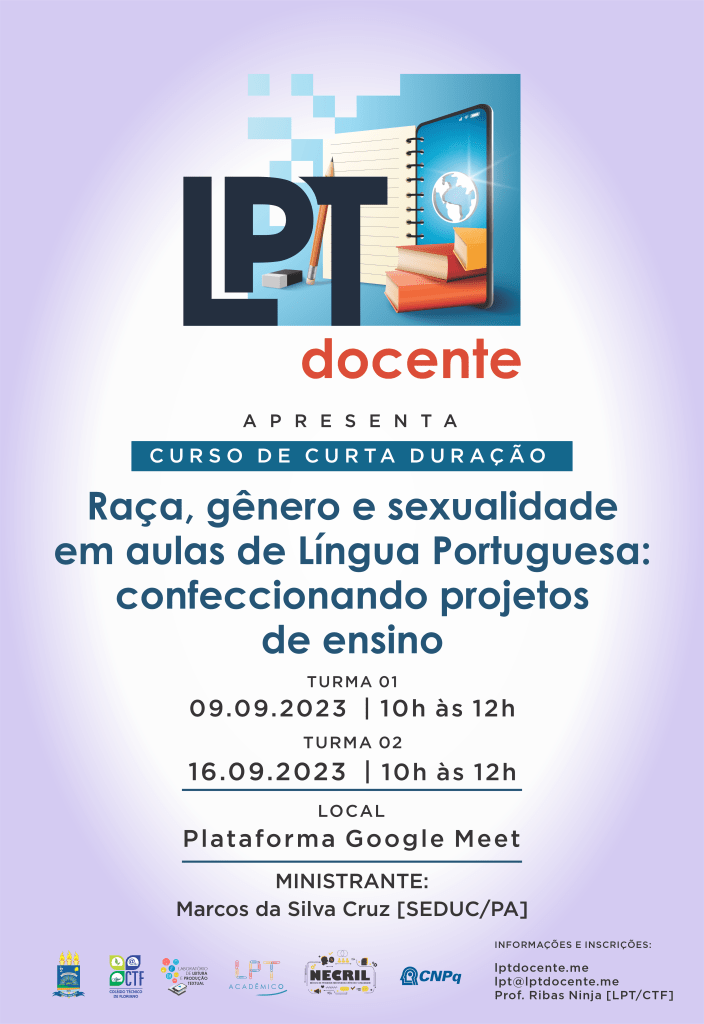 Estão abertas as inscrições gratuitas para o curso on-line de curta duração Raça, gênero e sexualidade em aulas de Língua Portuguesa: confeccionando projetos de ensino promovido pelo projeto de extensão LPT Docente do Laboratório de Leitura e Produção Textual [LPT/CNPq] do Colégio Técnico de Floriano [UFPI], em parceria com Núcleo de Pesquisa em Estudos Críticos e Linguagem [NECriL] e a Pró-Reitoria de Extensão e Cultura [PREXC/UFPI].