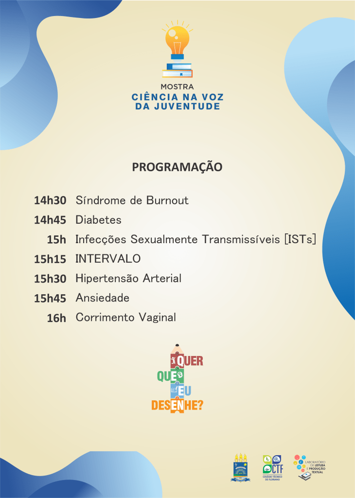 No dia 30 de novembro de 2023, o Laboratório de Leitura e Produção Textual [LPT/CNPq] realizará a segunda edição da Mostra Ciência na Voz da Juventude, atividade do projeto Quer Que Eu Desenhe?, em parceria com a turma do 2º módulo do Técnico em Enfermagem.