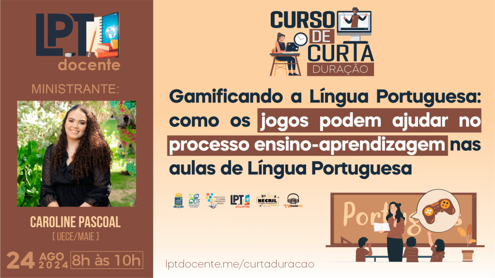 Estão abertas as inscrições gratuitas para o curso on-line de curta duração Gamificando a Língua Portuguesa: como os jogos podem ajudar no processo ensino-aprendizagem nas aulas de Língua Portuguesa promovido pelo projeto de extensão LPT Docente do Laboratório de Leitura e Produção Textual [LPT/CNPq] do Colégio Técnico de Floriano [UFPI], em parceria com Núcleo de Pesquisa em Estudos Críticos e Linguagem [NECriL]e a Pró-Reitoria de Extensão e Cultura [PREXC/UFPI].