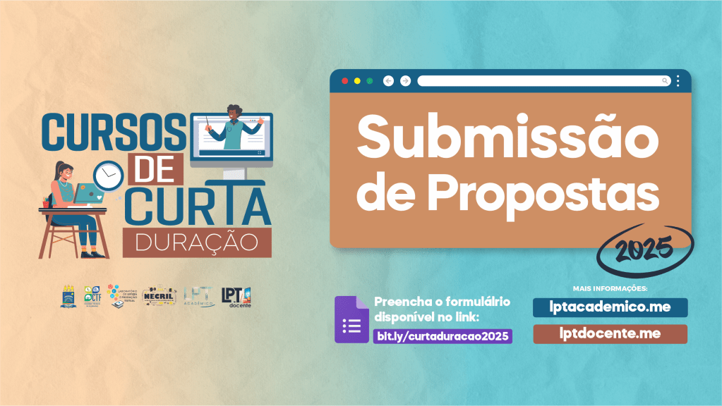 A Coordenação do LPT CONVIDA a comunidade acadêmica [docentes, técnicos e bolsistas do Colégio Técnico de Floriano; estudantes de graduação e pós-graduação da Universidade Federal do Piauí e de outras instituições públicas de ensino superior; membros do Núcleo de Pesquisas em Estudos Críticos e Linguagem [NECriL]; e parceiros do Laboratório de Leitura e Produção Textual – LPT/CNPq] a SUBMETEREM PROPOSTAS de cursos de curta duração a serem ministrados no ano de 2025, de forma gratuita e on-line, para os projetos LPT Acadêmico [escrita acadêmica/letramentos acadêmicos] e/ou LPT Docente [formação docente de Língua Portuguesa].