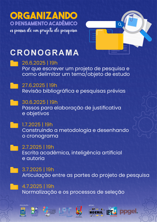 Estão abertas até 4 de julho de 2025 as inscrições para o curso on-line Organizando o pensamento acadêmico: os passos de um projeto de pesquisa. O curso tem organização do Laboratório de Leitura e Produção Textual (LPT/CNPq) do Colégio Técnico de Floriano/UFPI, por meio do projeto LPT Acadêmico, e pretende auxiliar a/o participante a compreender a estrutura de um projeto de pesquisa.