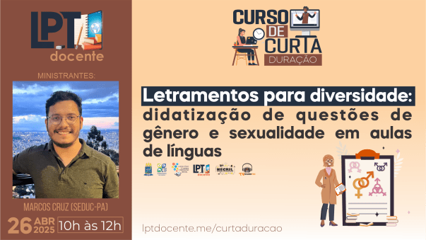 Já o curso Letramentos para diversidade: didatização de questões de gênero e sexualidade em aulas de línguas objetiva analisar dimensões teórico-metodológicas e didáticas implicadas na abordagem de questões de gênero e sexualidade em aulas de línguas e será ministrado pelo professor Marcos Cruz [SEDUC/PA], em turma única e com vagas ilimitadas. As atividades serão realizadas no canal da TV Radiotec no YouTube, conforme dia e horário descritos no cartaz a seguir: