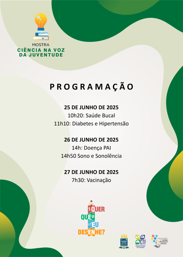 De 25 a 27 de junho de 2025, o Laboratório de Leitura e Produção Textual [LPT/CNPq] realizará a quarta edição da Mostra Ciência na Voz da Juventude, atividade do projeto Quer Que Eu Desenhe?, em parceria com a turma do 1º módulo do Técnico em Enfermagem.