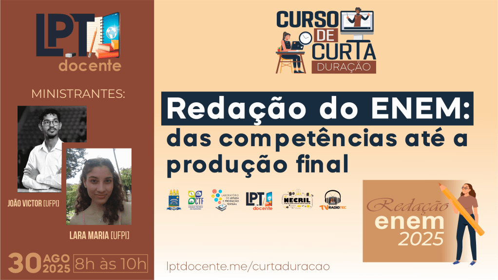 Estão abertas até 29 de agosto de 2025 as inscrições gratuitas para o curso on-line de curta duração Redação do ENEM: das competências até a produção final promovido pelo projeto de extensão LPT Docente do Laboratório de Leitura e Produção Textual [LPT/CNPq] do Colégio Técnico de Floriano [UFPI], em parceria com Núcleo de Pesquisa em Estudos Críticos e Linguagem [NECriL] e a Pró-Reitoria de Extensão e Cultura [PREXC/UFPI].