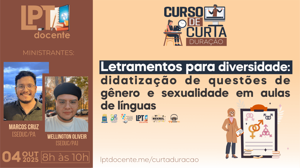 O curso Letramentos para diversidade: didatização de questões de gênero e sexualidade em aulas de línguas objetiva analisar dimensões teórico-metodológicas e didáticas implicadas na abordagem de questões de gênero e sexualidade em aulas de línguas e será ministrado pelos professores Marcos Cruz [SEDUC/PA] e Wellington Oliveira [SEDUC/PA], em turma única e com vagas ilimitadas. As atividades serão realizadas no canal da TV Radiotec no YouTube, conforme dia e horário descritos no cartaz a seguir: