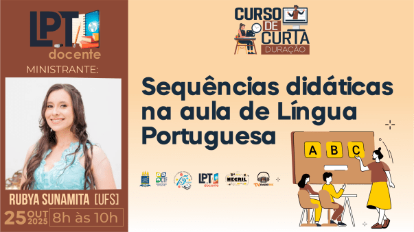 Estão abertas até 24 de outubro de 2025 as inscrições gratuitas para o curso on-line de curta duração Sequências didáticas na aula de Língua Portuguesa promovido pelo projeto de extensão LPT Docente do Laboratório de Leitura e Produção Textual [LPT/CNPq] do Colégio Técnico de Floriano [UFPI], em parceria com Núcleo de Pesquisa em Estudos Críticos e Linguagem [NECriL] e a Pró-Reitoria de Extensão e Cultura [PREXC/UFPI].