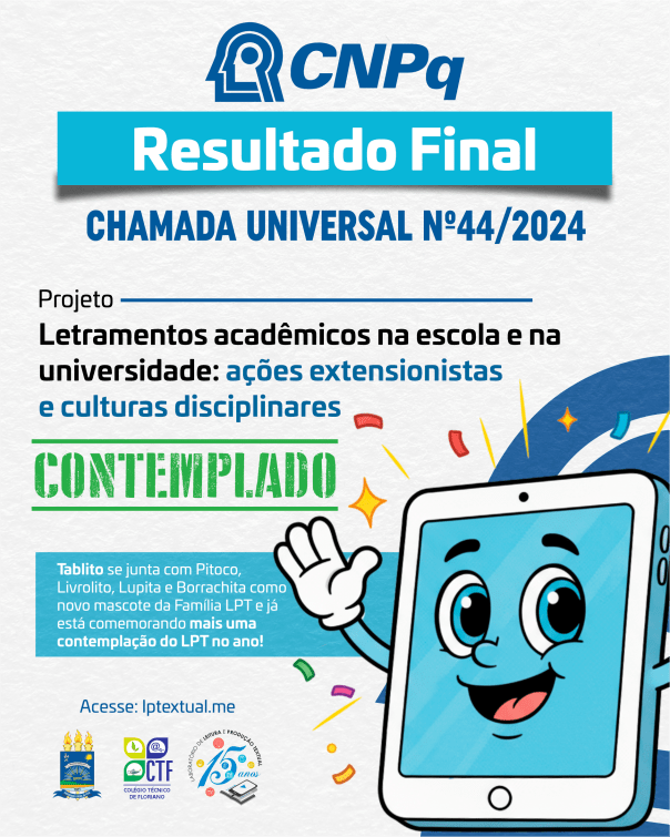 O Laboratório de Leitura e Produção Textual [LPT/CNPq] do Colégio Técnico de Floriano/UFPI foi contemplado com apoio financeiro e bolsas [de apoio técnico e iniciação científica] para o projeto de pesquisa Letramentos acadêmicos na escola e na universidade: ações extensionistas e culturas disciplinares no Resultado Final da Chamada Universal Nº 44/2024 do @cnpq_oficial, publicado no dia 14 de novembro de 2025.