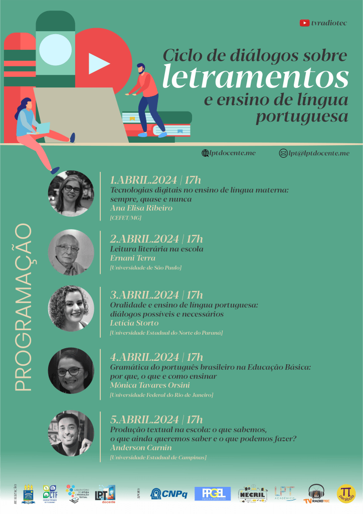 O Ciclo de Diálogos será realizado de 1 a 5 de abril de 2024, no canal da TV Radiotec no YouTube e objetiva socializar com a comunidade docente e estudantes de Letras, estratégias e metodologias de ensino referentes aos eixos do componente Língua Portuguesa, preconizados pela BNCC e demais diretrizes curriculares, de modo que novas práticas possam surgir, a fim de contribuir com a melhora da aprendizagem de discentes da educação básica.