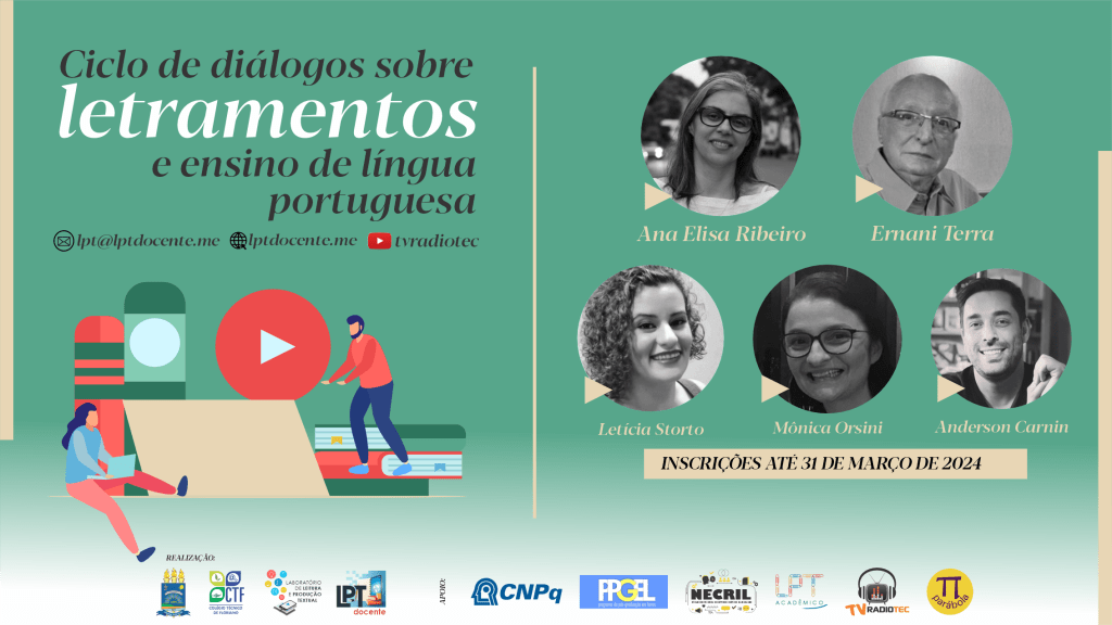 Estão abertas até 31 de março de 2024 as inscrições gratuitas para a quarta edição do Ciclo de Diálogos sobre Letramentos e Ensino de Língua Portuguesa, uma ação do projeto de pesquisa “Escola Virtual: Letramento digital para o ensino a distância e seu impacto na aprendizagem”, denominado LPT Docente, do Laboratório de Leitura e Produção Textual [LPT/CNPq] do Colégio Técnico de Floriano e coordenado pelo professor Ribamar Júnior.
