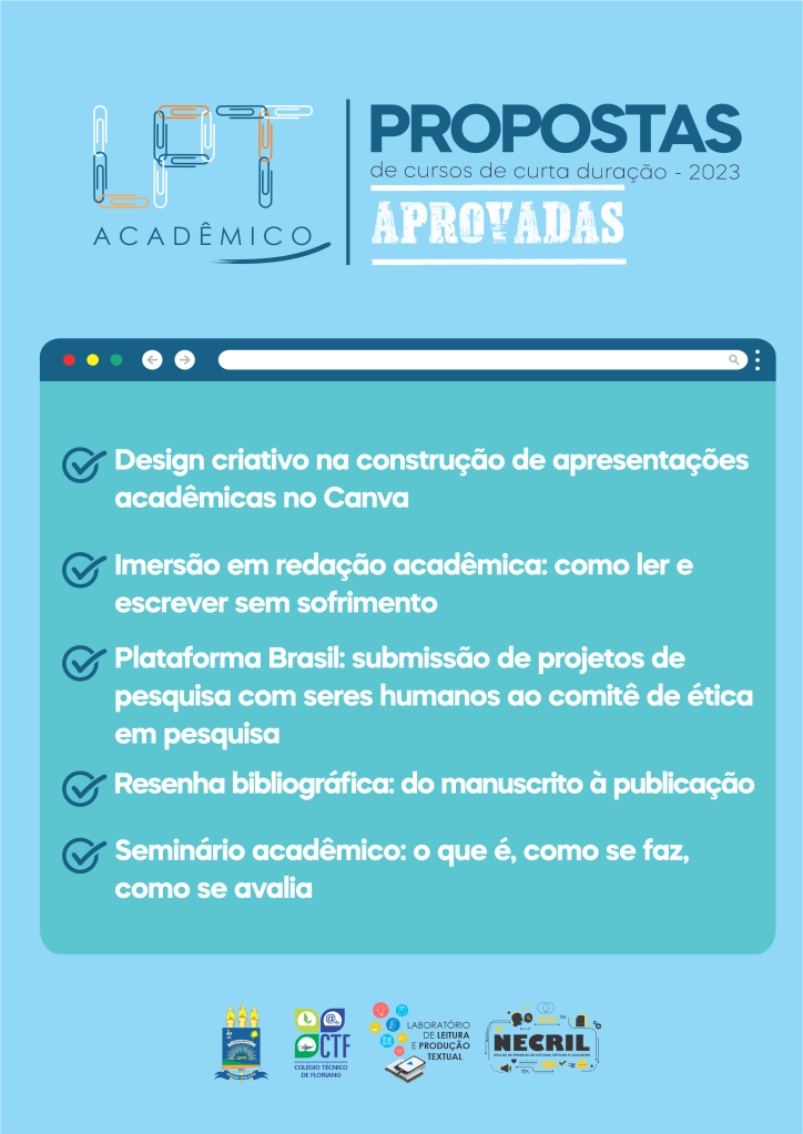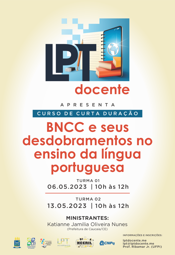 Estão abertas as inscrições gratuitas para o curso on-line de curta duração BNCC e seus desdobramentos no ensino de língua portuguesa promovido pelo projeto de extensão LPT Docente do Laboratório de Leitura e Produção Textual [LPT/CNPq] do Colégio Técnico de Floriano [UFPI], em parceria com Núcleo de Pesquisa em Estudos Críticos e Linguagem [NECriL] e a Pró-Reitoria de Extensão e Cultura (PREXC/UFPI).