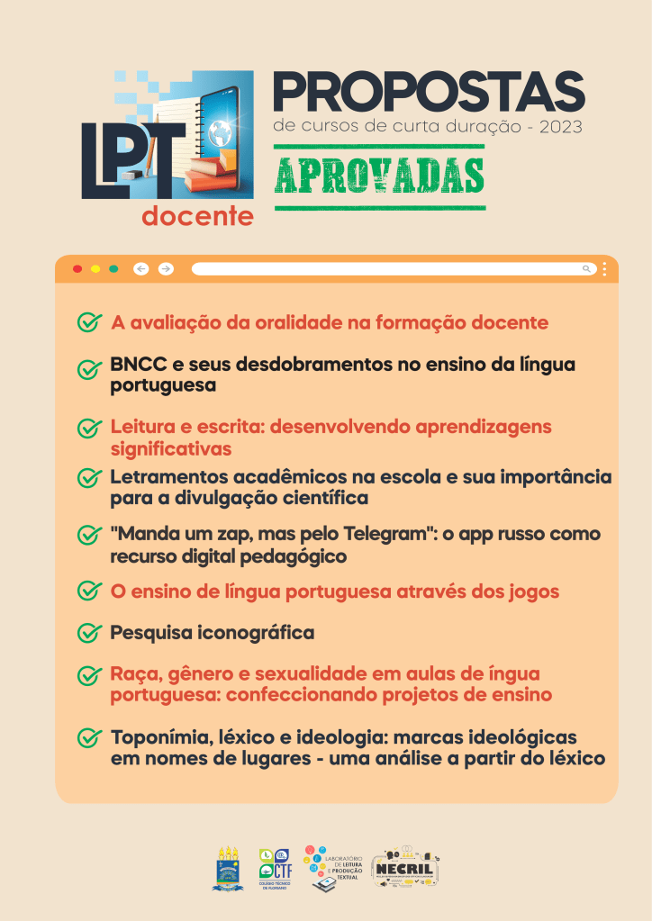 A Coordenação do LPT divulga o resultado da chamada para submissão de propostas de cursos de curta duração dos projetos LPT Docente e LPT Acadêmico a serem ministrados no ano de 2023, de forma gratuita e on-line: