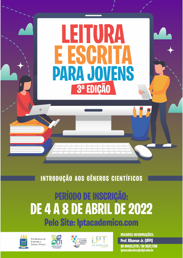 O Laboratório de Leitura e Produção Textual (LPT/CNPq) do Colégio Técnico de Floriano/UFPI realiza até o dia 19 de agosto as inscrições para a 4ª edição do curso de extensão on-line e gratuito Leitura e escrita para jovens: introdução aos gêneros científicos. Os estudantes podem se inscrever por meio do sistema Integrado de Gestão de Atividades Acadêmicas (SIGAA).
