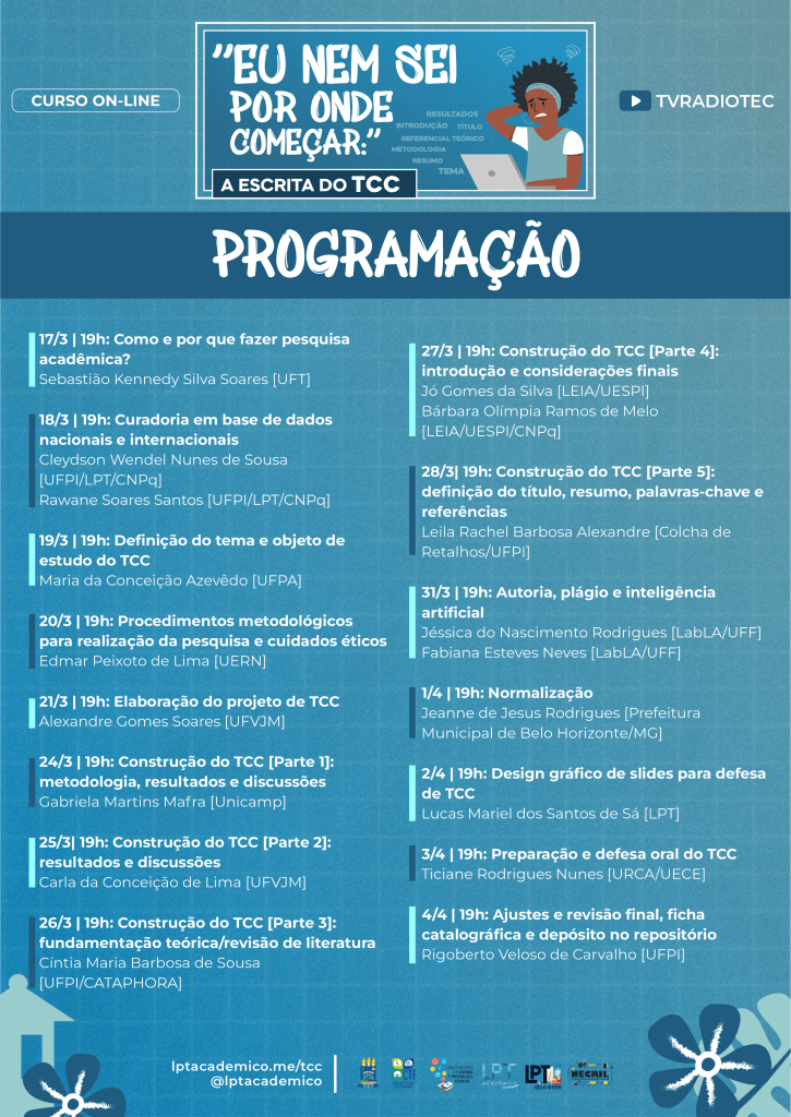Estão abertas até 13 de março de 2025 as inscrições para o curso on-line “Eu nem sei por onde começar”: a escrita do TCC. O curso tem organização do Laboratório de Leitura e Produção Textual [LPT/CNPq] do Colégio Técnico de Floriano/UFPI, por meio do projeto LPT Acadêmico, e pretende auxiliar o participante a compreender a estrutura de um Trabalho de Conclusão de Curso.